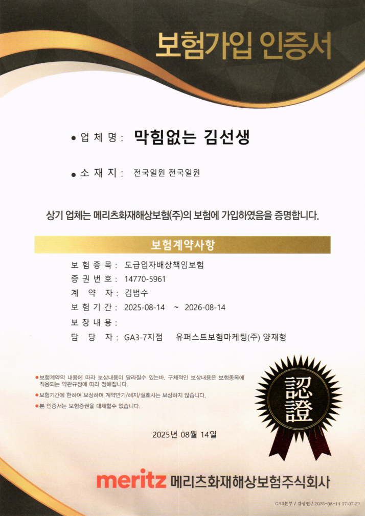 막힘없는김선생은 모든 작업에 대해 도급 배상책임보험에 가입하여 작업 중 발생할 수 있는 고객님의 재산 피해를 법적으로 보장합니다.